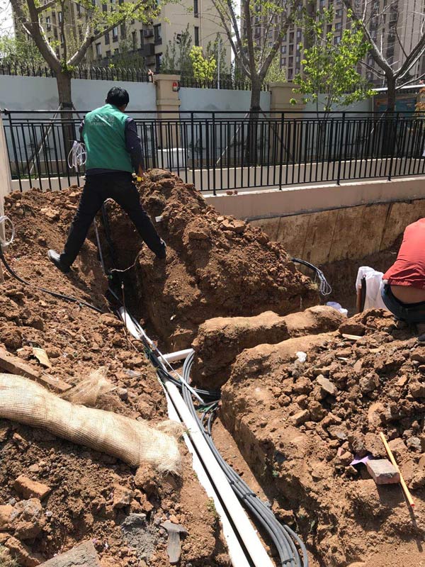 (2)按設計圖標位置先放線,挖溝(草坪區域}深度30cm以下,檢查無誤后埋置合格的導管,