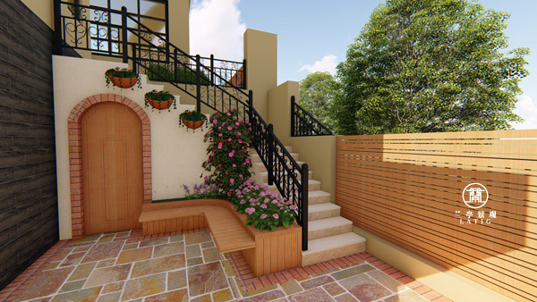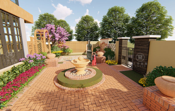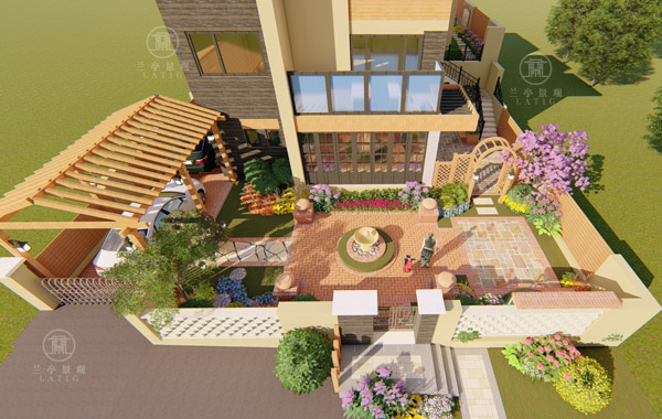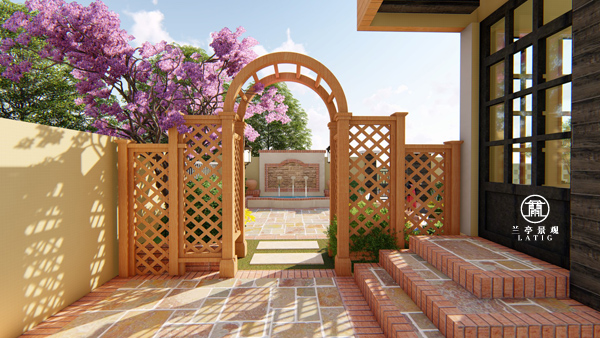 設計師說明:該庭院以歐式田園風格為主,整體以紅色系為主,南院設置有中心水景,歐式廊架,水池景墻及歐式木質拱形屏風,北院設置有燒烤臺,水池景墻,及休憩木座凳,搭配精致的水缽及花缽等裝飾,整體風格田園粗礦又不失細節,設計手法上突出了自然田園、與大自然融為一體的設計理念。同時體現了主人熱愛生活,遠離城市喧囂,享受幽靜的生活態度。