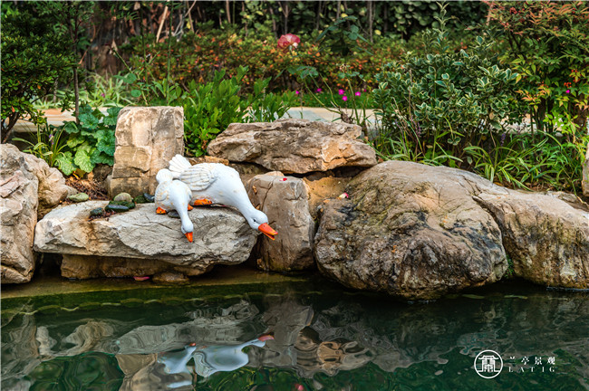 沿著自然的碎拼小路走到山邊水邊,倚欄觀魚游,池邊聽泉音,讓人自然而然的放慢腳步,停下來享受此時此刻的美景。 假山不僅在園中起到了觀賞的作用,又賦予了招財聚寶的寓意。假山旁邊是一處涼亭,坐在亭中,滿園美景盡收眼底,適合用來讀書、喝茶、作畫、聊天、獨處。在自然駁岸水系周圍,配合植物圍合點綴營造意境,仿佛將大自然搬到了自家院子,閑暇時聽枝頭鳥鳴,賞魚游水動,看綠葉婆娑,很是愜意。
