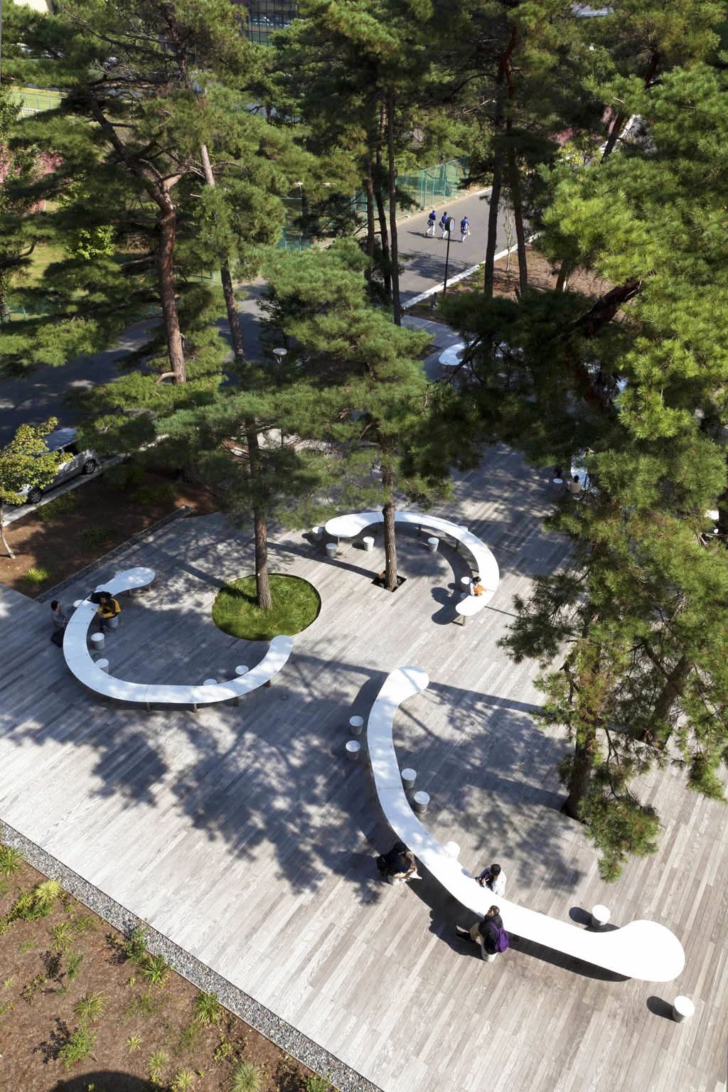 改造最大程度的消除了這片花園與四周的隔離,建立了室內室外一體化的空間體系,師生們可以自由地從各個方向無障礙地進入。桌面上還內置了花草盆景,創造出與樹為鄰的學習交流空間。樹桌能夠提供一堂特別的室外課程。由于與一樓門廳相連,也可滿足學校層級一些非正式的、輕松的小型交流活動。